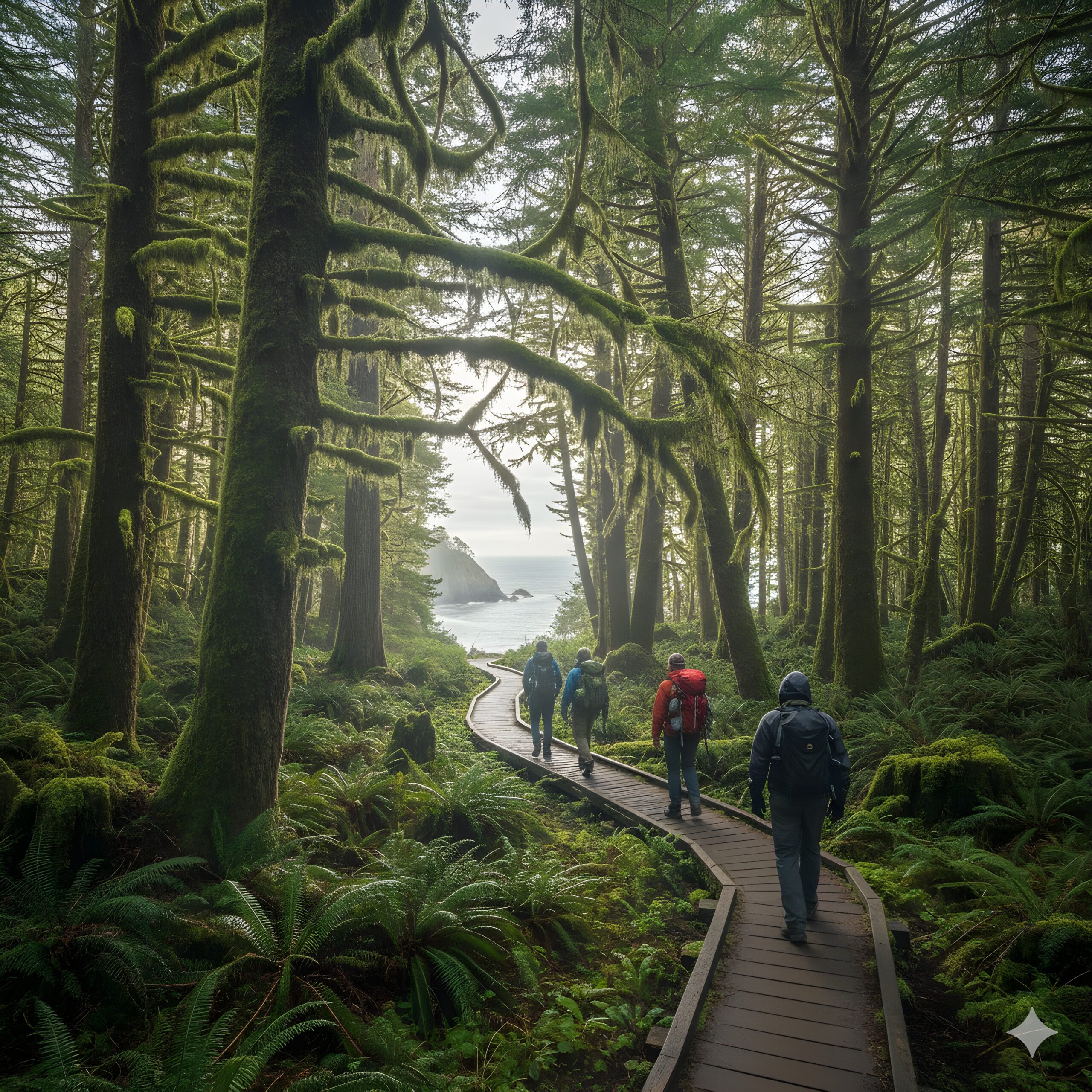 Continuing, you’ll encounter 15 switchbacks before leveling off, where you’ll have opportunities to view Clark’s Mountain. You might see some wildlife, including deer and elk, in this area, so be aware. Traveling onward up another switchback, you’ll reach a mossy forest with a boardwalk, which takes you near Clark’s Viewpoint. After passing through a secondary forest of spruce and hemlock, you’ll move past a cliff area and view a huge ten-foot stump rotting in waste.